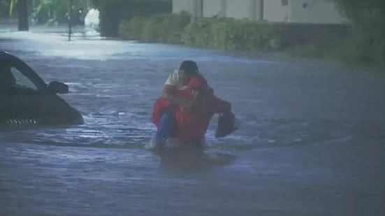 Enquanto a carregava para um local seguro, a mulher se agarrou ao pescoço do repórter até que a água chegasse à altura de seus tornozelos e fosse seguro para ela andar sozinha.