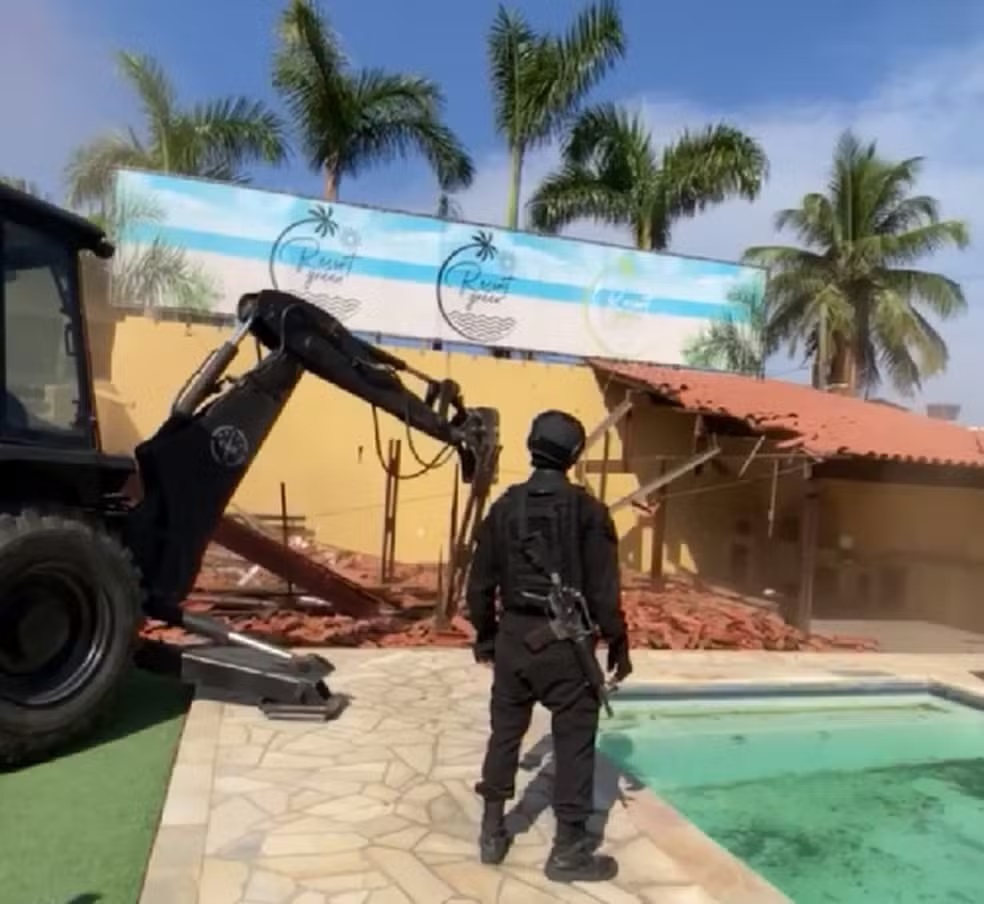 O “Resort Green”, como é chamado, é demolido com a ajuda de máquinas da PM que são usadas na destruição de construções ilegais. A estrutura conta com piscina, espaço para churrasco e ambientes climatizados.