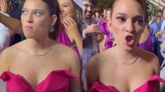 Registrado em um vídeo, o momento em que a ex-BBB joga o arranjo de flores para os convidados rendeu uma cena icônica da apresentadora de Túnel de Amor extremamente frustrada por perder a disputa para um amigo da noiva.