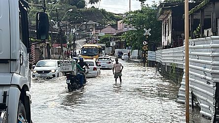 As chuvas intensas que castigam Alagoas nos últimos dias seguem causando problemas. Nesta segunda-feira, 10, o transbordamento do Riacho do Silva deixou o trânsito lento e provocou prejuízos a motoristas na região da Praça Coronel Lucena Maranhão, no bairro de Bebedouro, em Maceió.