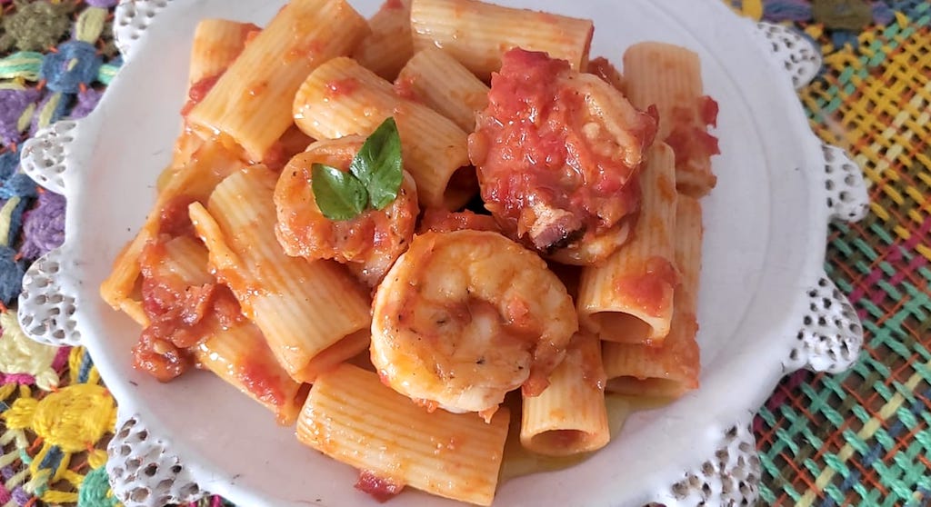 Rigatoni (massa italiana) no molho de tomate com camarões