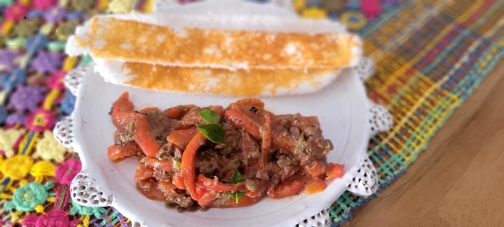 E para quem gosta de uma opção vegetariana tem os cogumelos, bem temperados e de forma simples com pimenta do reino, sal e leite de coco, acompanhados de torradas ou tiras de beiju.