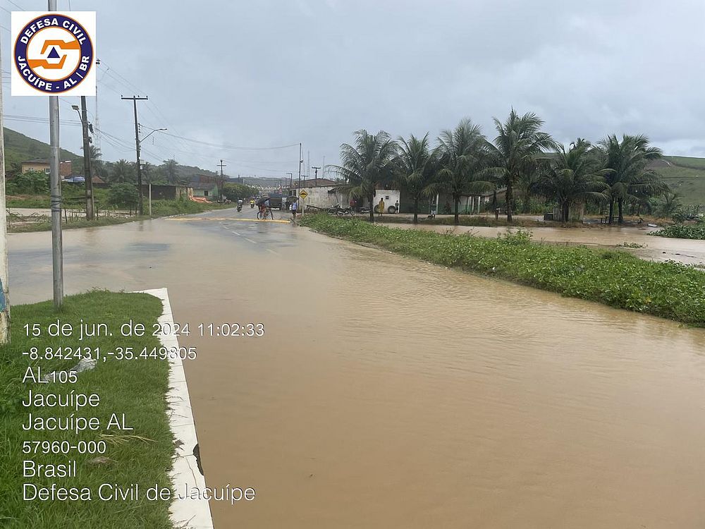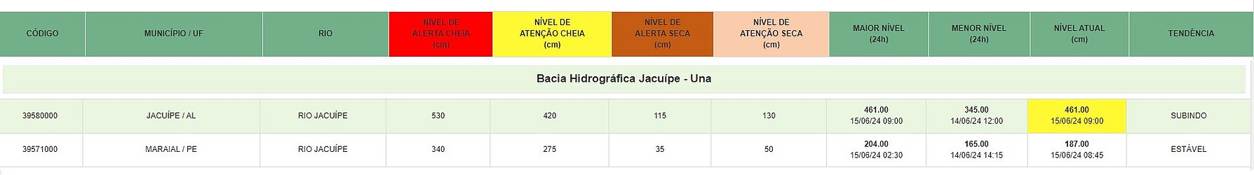 A cota do Rio Jacuípe atingiu o nível de atenção e segue em elevação na manhã deste sábado (15) após as chuvas que caem na região Norte de Alagoas e Sul de Pernambuco. A informação foi passada pela Defesa Civil alagoana.