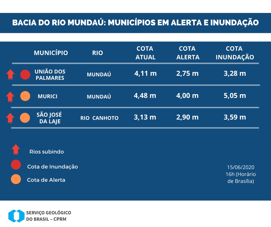 A cota atual do rio Mundaú em União dos Palmares é 4,11 metros, superior a cota de inundação, que é atingida no município aos 3,28m. Em Murici, a cota atual é 4,48 metros, portanto o patamar hoje é de alerta, após ter transbordado no domingo, porém o rio voltou a subir e pode atingir a cota de inundação, que é de 5,05 metros novamente. A previsão meteorológica é de mais chuvas e a equipe segue monitorando o comportamento dos rios da bacia.