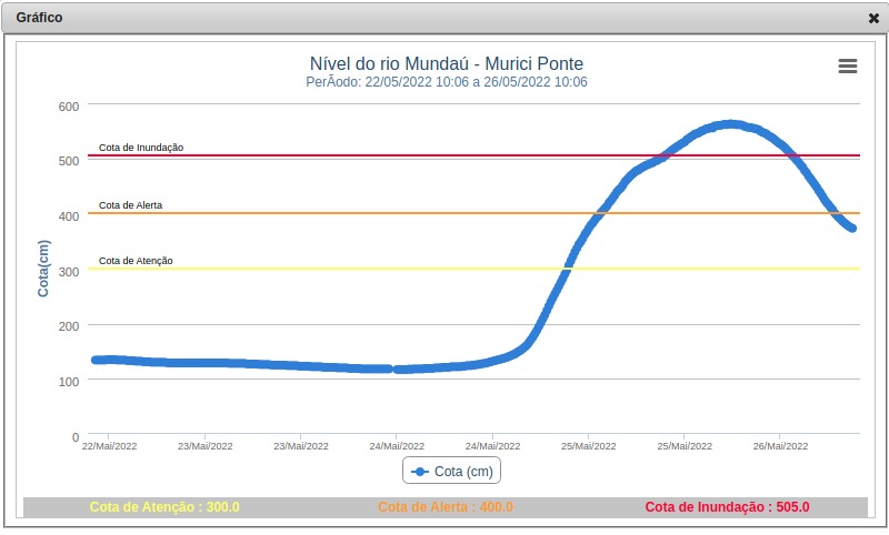 O Rio Mundaú teve redução na cota de inundação na manhã desta quinta (26), atingindo a marca de 3.42 metros. Em comparação com a quarta (25), o rio chegou a superar 5 metros, o que alertou as áreas das cidades de União dos Palmares e Murici, na Zona da Mata. O gráfico de monitoramente (imagem abaixo) mostra a redução do nível de inundação.