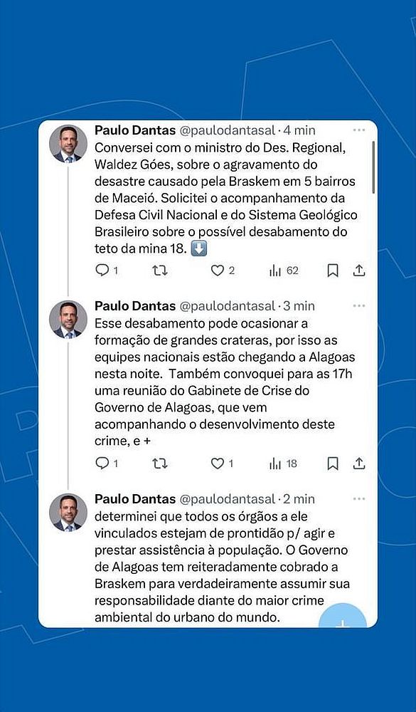 “Conversei com o ministro do Desenvolvimento Regional, Waldez Góes, sobre o agravamento do desastre causado pela Braskem em cinco bairros de Maceió. Solicitei o acompanhamento da Defesa Civil Nacional e do Serviço Geológico do Brasil (CPRM) sobre o possível desabamento do teto da mina 18”, afirmou o governador.