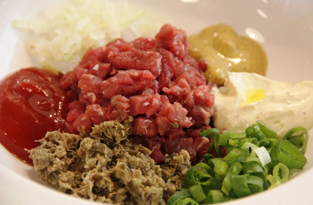 Tradição do Castro: Steak Tartare, uma receita de carne crua, finamente picada e servida com vários condimentos como mostarda, ketchup, maionese e alcaparras