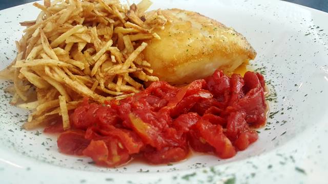 Bacalhau com tomates no azeite e ervas, e batata palha (produção da cozinha Castro)