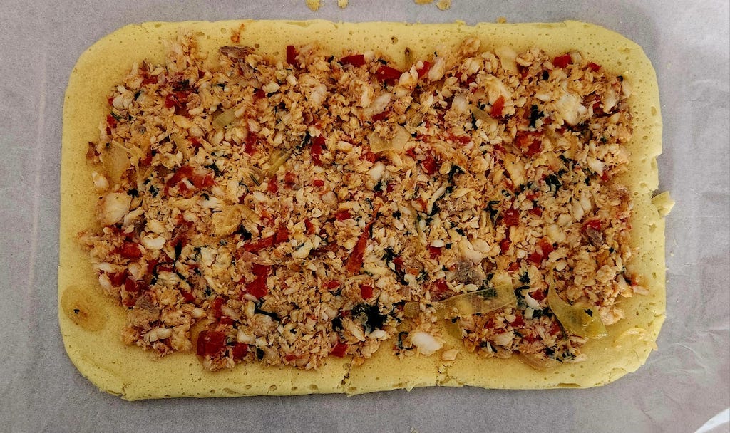 Modo de preparo:🧑🍳 Separe as claras das gemas e reserve.🥄 Bata no liquidificador o arroz cozido, leite de coco, óleo de coco, maisena e as gemas até ficar homogêneo.🧑🍳 Bata as claras em ponto de neve e misture ao creme preparado no liquidificador. Por último, coloque o fermento e misture.🥄 Coloque para assar em forma retangular untada, mais ou menos 30 minutos, ou quando colocar o palito ou garfo e sair seco. A massa não precisa dourar muito.🧑🍳 Retire do forno e, ainda quente, em um pano de prato ou papel manteiga, vire a forma pra que a massa saia inteira no pano.🥄 Assim que desenformada, coloque o recheio de peixe. Depois de colocado os ingredientes, enrole junto com o pano de prato ou papel manteiga em forma de rocambole.