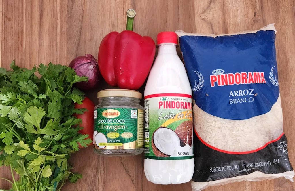 Arroz, óleo e leite de coco Pindorama para fazer a receita do Rocambole de arroz