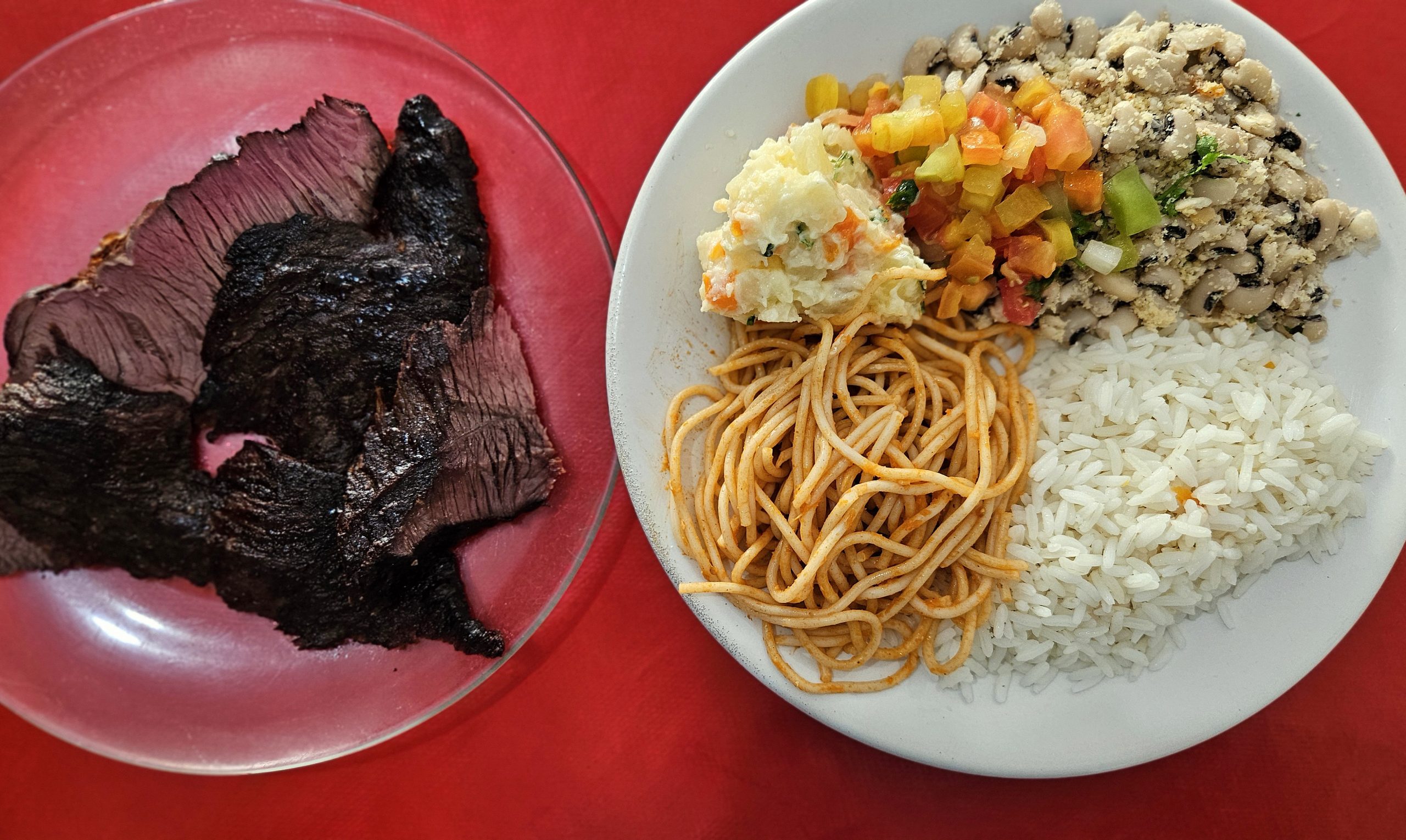 Para escoltar as proteínas, feijão, arroz, macarrão, maionese, vinagrete e duas farofas, uma de ovo (espetáculo). Fique ligado: não tem Instagram, chegue cedo, porque às 14h a costelinha, a mais queridinha de todos, só tinha dois pedaços, provei e derrete no céu da boca. Anote o endereço: Rua Ruthe Reis, 59 – Ponta da Terra. Funciona das 11 até às 16h, de frente ao colégio Santa Rosa. A dica valiosa foi do Rodrigo Lima (@rodrigolima84.adv)