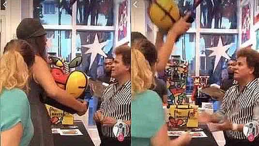 A mulher, que quebrou a obra avaliada em US$ 4.800 (cerca de R$ 25,9 mil) afirma nos vídeos que é dona de um restaurante que fica na frente da loja do artista e que era fã dele. "Considerava você um homem respeitável, mas me equivoquei", disse ela a Britto em uma galeria dele, em Miami, nos EUA.