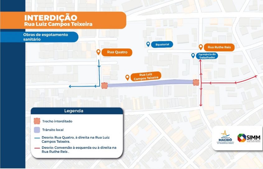 A obra acontece em um trecho da Rua Luiz Campos Teixeira e a interdição fica entre as ruas Quatro e Ruthe Reis, com o tráfego nesse ponto sendo liberado apenas para trânsito local. Os motoristas que transitam pela Rua Luiz Campos Teixeira podem fazer a conversão à esquerda ou à direita na Rua Ruthe Reis. Já os condutores que seguem pela Rua Quatro só devem seguir à direita na Rua Luiz Campos Teixeira.