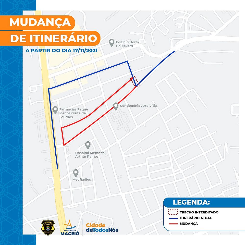 A Superintendência Municipal de Transportes e Trânsito de Maceió (SMTT) informa à população que, a partir desta quarta-feira (17), um trecho da Rua Elói Lemos de França, na Gruta de Lourdes, será interditado para obras de saneamento. A previsão é que os serviços sejam finalizados no próximo dia 20 de novembro.
