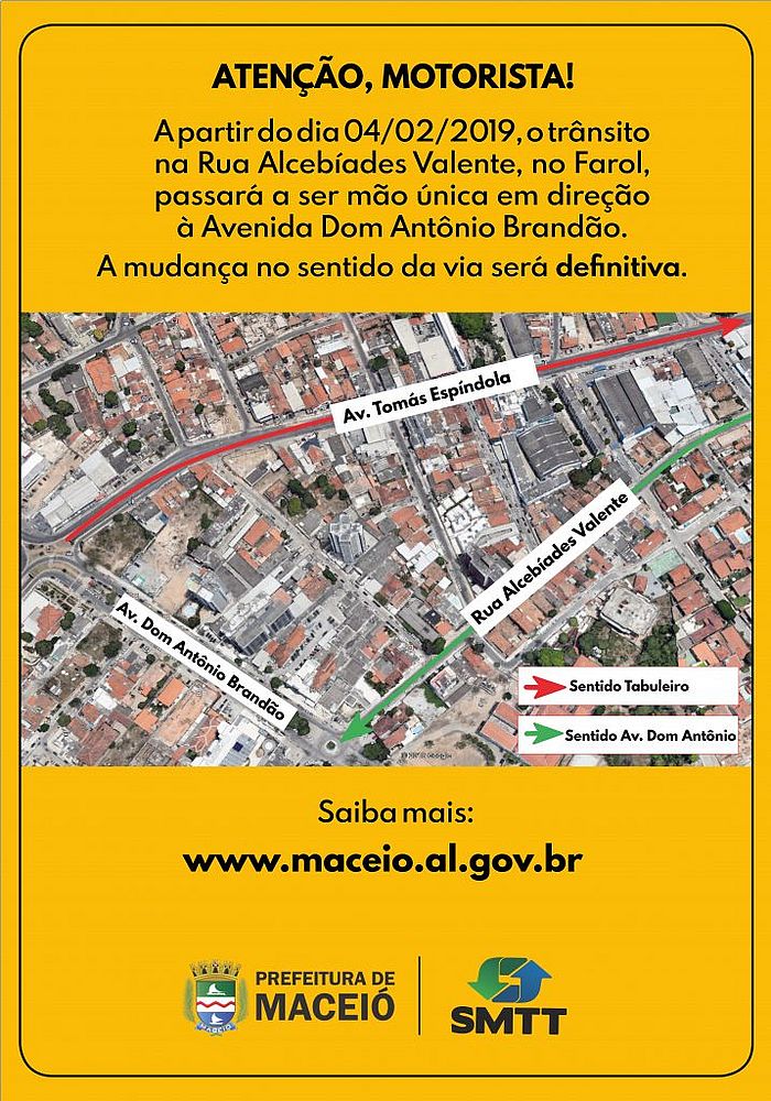 Nesta segunda-feira (04), o trânsito da Rua Alcebíades Valente, no bairro do Farol, terá o seu sentido de direção modificado definitivamente. A via passará a ser mão única em direção à Avenida Dom Antônio Brandão. A alteração tem como objetivo garantir uma maior fluidez ao tráfego de veículos que se deslocam diariamente pela região, especialmente em horários de pico.
