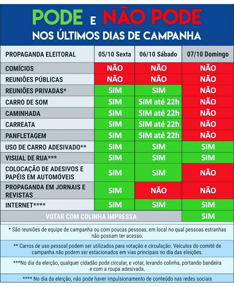 A panfletagem está proibida pelo Tribunal Superior Eleitoral desde ontem às 22h, assim como caminhadas e carreatas. Também não é permitido deixar papéis com propaganda de candidato nos veículos.