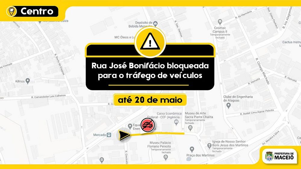 A Superintendência Municipal de Transportes e Trânsito (SMTT) informou aos condutores de veículos que, a partir desta quinta-feira (07), a Rua José Bonifácio, no Centro, será interditada temporariamente. Os bloqueios serão realizados pela agência da Caixa Econômica Federal, que utilizará a via para organizar as filas e diminuir a aglomeração de maceioenses que aguardam para receber o pagamento do auxílio emergencial.