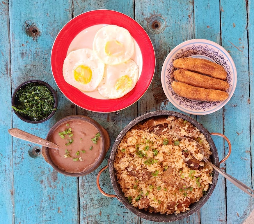 O arroz de costelinha é perfeito: o grão frito recebe o caldo da carne, ganha mais sabor, e claro, a costelinha temperada com as tradições mineiras solta do ossinho. É bom, e aquele arroz temperado que só mineiro sabe fazer é viciante. Para escoltar, vem três ovos, três bananas empanadas, tutu à mineira e couve, ou seja, três compartilham felicidade e cada um tem uma banana e um ovo para chamar de seu.