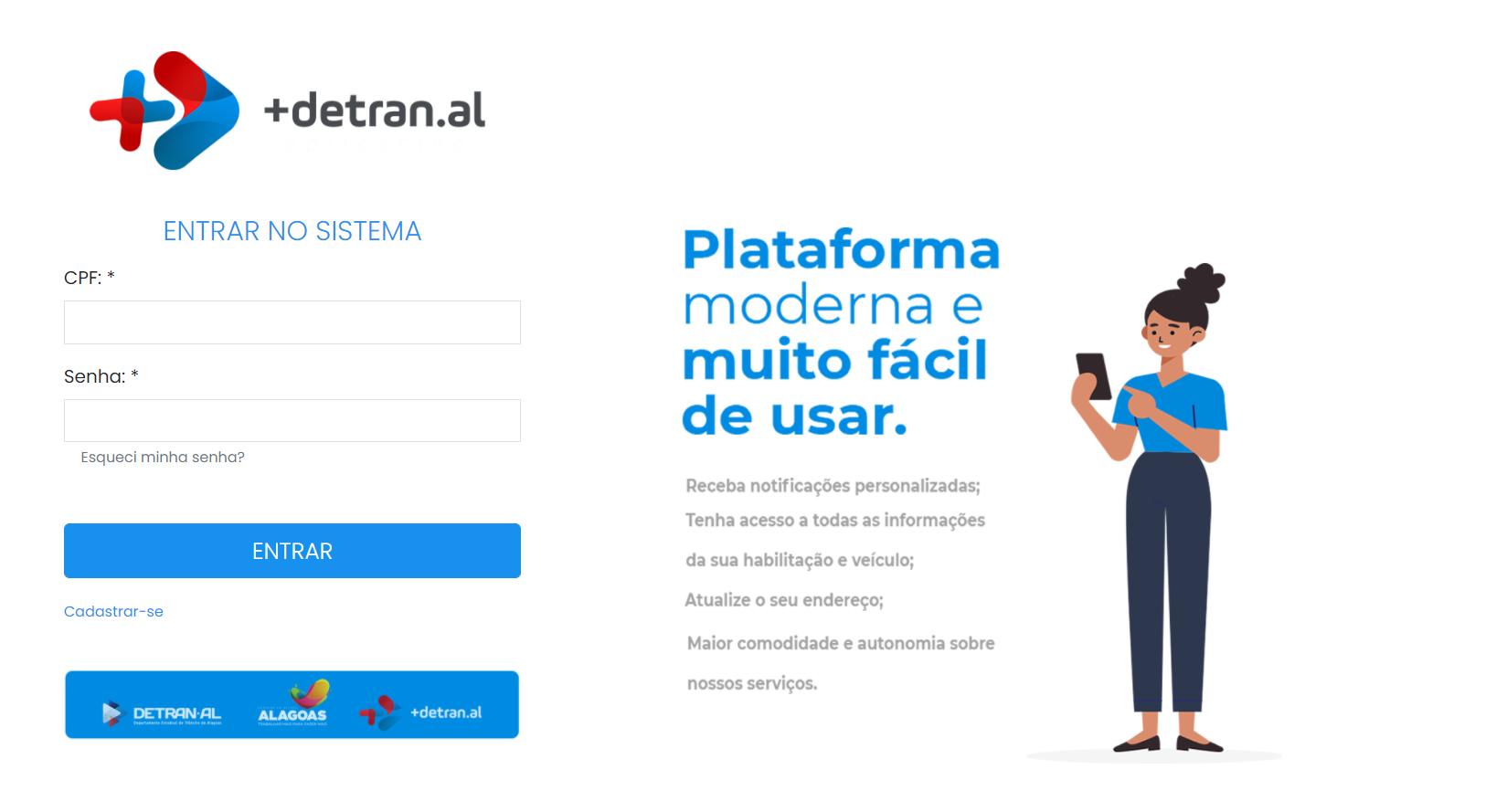 Para utilizar o portal Mais Detran, basta entrar no site do Detran/AL ou acessar diretamente o link. O primeiro passo será realizar o cadastro clicando em “Cadastrar-se” e preenchendo os campos solicitados.