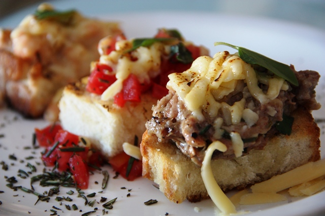 Bruschettas – Fatias de pão integral, fabricação da própria casa, são coroadas com carne de sol e tomates. A novidade é a de cogumelos no molho de bechamel (molho branco) finalizado com ervas. Sabor forte e bom.