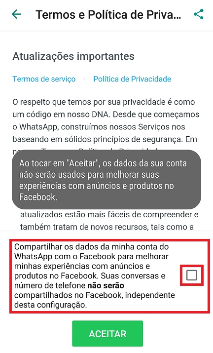 Felizmente, o mínimo que o WhatsApp poderia era permitir que os usuários bloqueassem essa opção de compartilhamento. O recurso foi criado, contudo, você tem até o dia 24 de setembro para aceitar ou não estes novos termos e políticas.