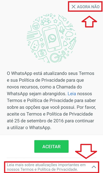 Se você ainda não abriu o WhatsApp, quando abrir, provavelmente vai encontrar esta tela da imagem abaixo. As opções são as seguintes: "Agora não" ou "Leia mais sobre atualizações importantes...". Não clique em "Aceitar".