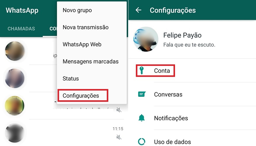 Agora, escolha "Configurações" e, então, "Conta" Veja: