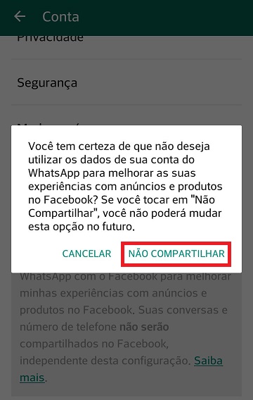 Você tem certeza de que não deseja utilizar os dados de sua conta do WhatsApp para melhorar as suas experiências..., deve aparecer em uma caixa. Escolha "Não compartilhar" e pronto.