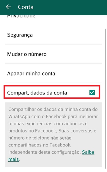 Rolando a lista de tópicos, se o seu WhatsApp estiver atualizado, você vai encontrar a seguinte opção: "Compart." dados da conta; e um botão check ao lado. Toque sobre este botão para a caixa ficar vazia. Acompanhe: