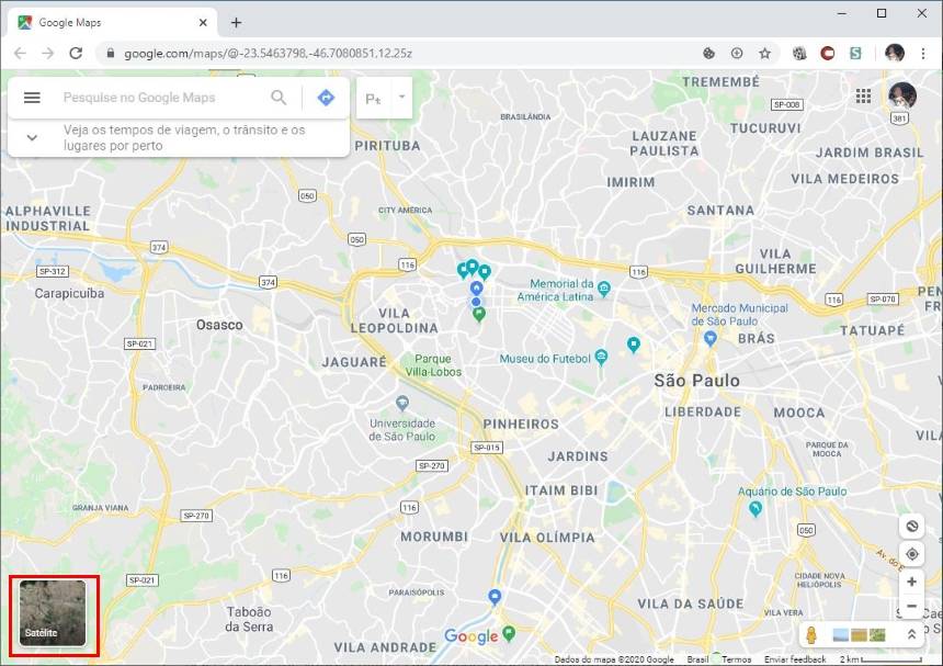 3. No canto inferior esquerdo da tela, clique em “Satélite”, conforme mostra a imagem abaixo;