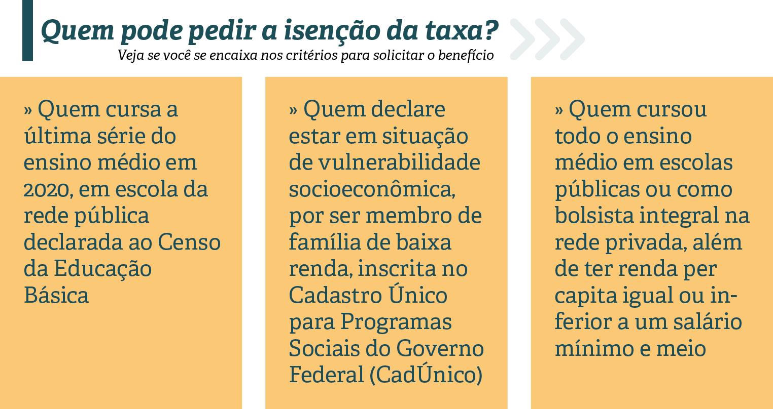 A taxa de inscrição, entretanto, pode ser um empecilho. Em 2019, cerca de 3 milhões de pessoas solicitaram a isenção da taxa, que custava R$ 85. O valor para as provas de 2020 ainda não foi divulgado. O prazo para pleitear a isenção neste ano vai até o dia 17 de abril.