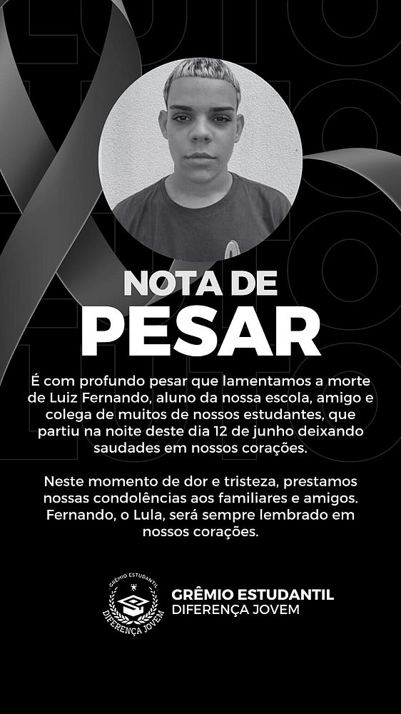 “É com profundo pesar que lamentamos a morte de Luiz Fernando, aluno da nossa escola, amigo e colega de muitos de nossos estudantes, que partiu na noite deste dia 12 de junho deixando saudades em nossos corações. Neste momento de dor e tristeza, prestamos nossas condolências aos familiares e amigos. Fernando, o Lula, será sempre lembrado em nossos corações".