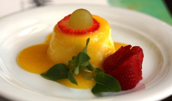 Nova versão – Sem açúcar, mas com afeto, é o pudim de leite de gado. Não leva o condensado, portanto, o sabor é mais suave. A calda de manga faz a diferença ao paladar.