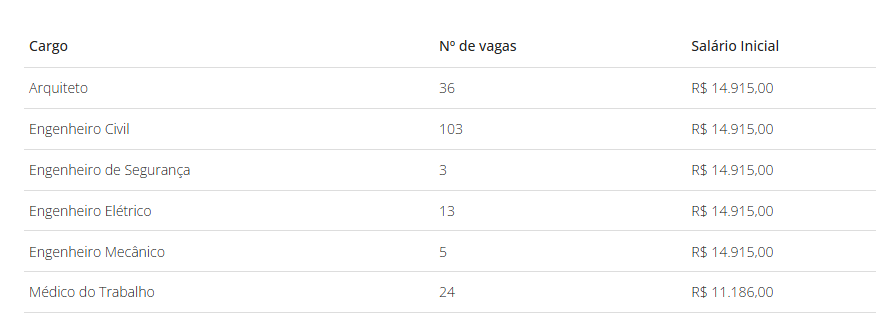 Ao todo, são 184 vagas distribuídas entre seis cargos. A maior parte é para engenheiros civis, mas também há oportunidades para arquitetos e médicos do trabalho. Os salários variam de R$ 11.186,00 a R$ 14.915,00.