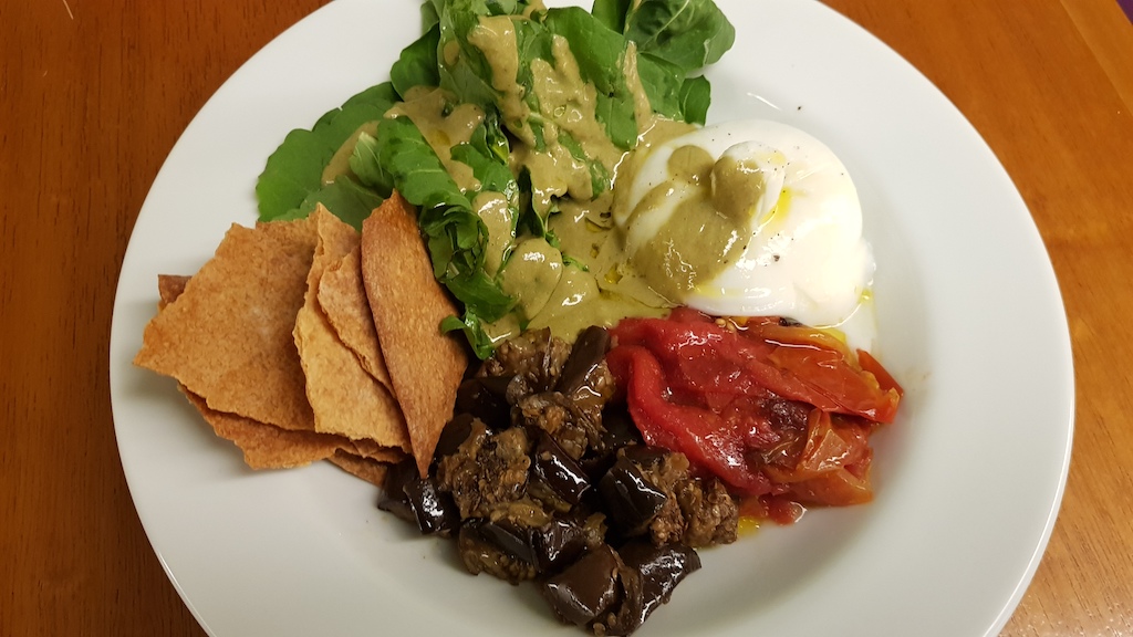 Salada com burrata, tomates assados, beringela, um dos sucessos da Oliva