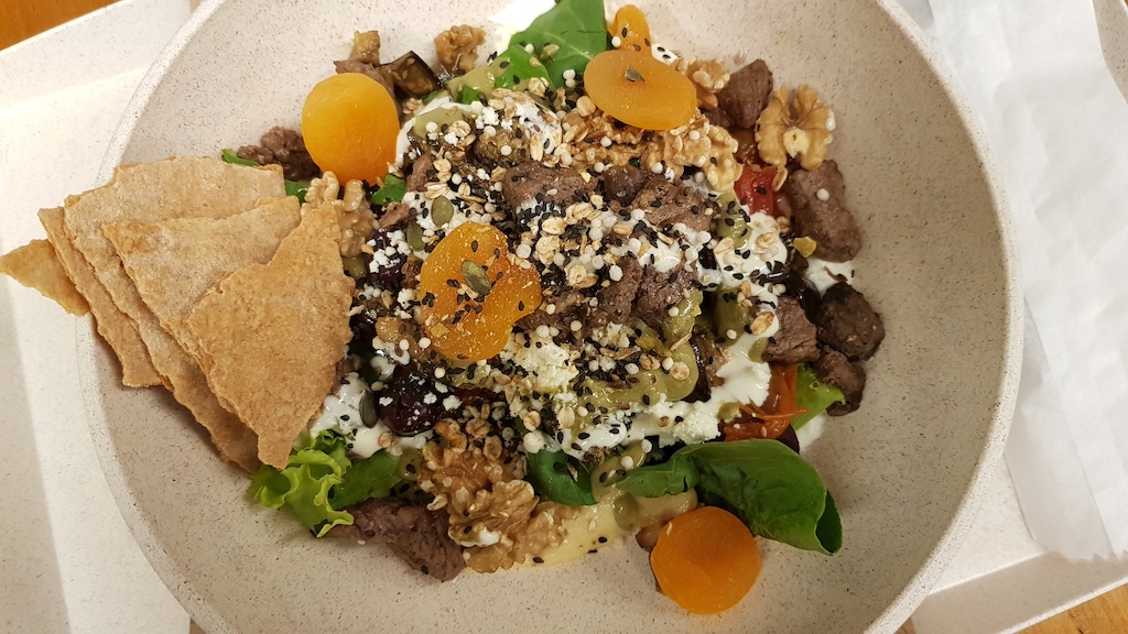 Com o aval das chefs consultoras, Mariana e Flavia, montei uma salada com mix de folhas, homus (pasta de grão de bico), coalhada, tiras de filé, semente de girassol, damasco, nozes e ricota. Para um final feliz, molho de iogurte com hortelã. Ficou supimpa.