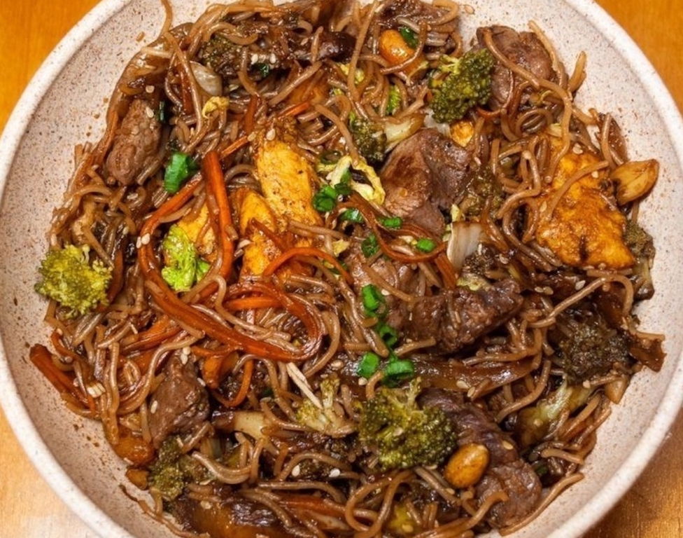 Yakisoba Fit: bifum, espaguete de abobrinha, espaguete de cenoura, acelga, brócolis, alho, cebola, gergelim torrado e amendoim