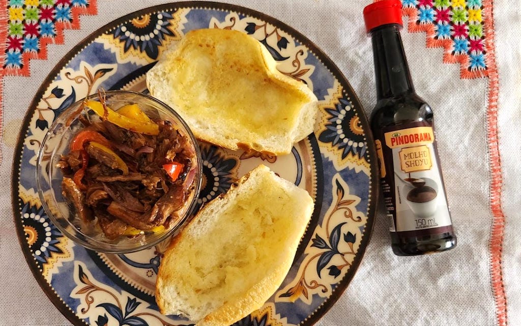 Pão francês, carne desfiada no Shoyu da Pindoroma