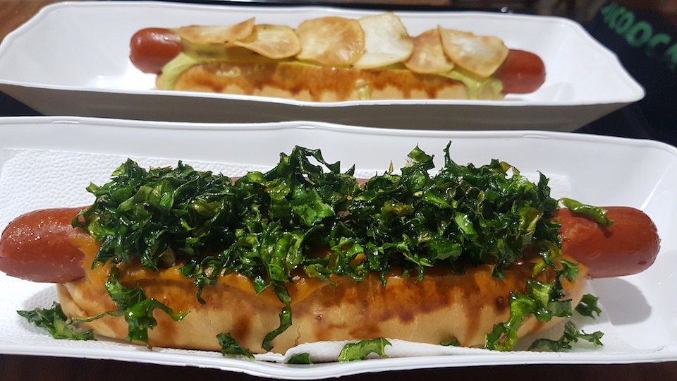Hot dog com sabores diferentes: couve crisp (frente) e de Brocolis com batata chip