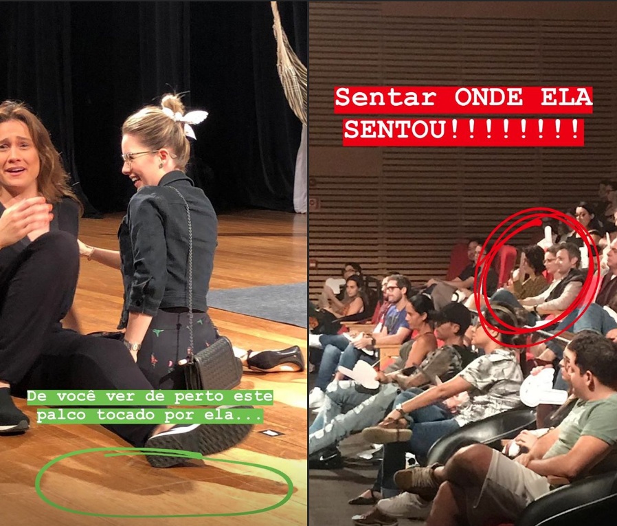 Fã assumida de Sandy, 36, a apresentadora Fernanda Gentil, 32, foi surpreendida pela cantora no final da apresentação da peça "Sem Cerimônia", em Campinas (93 km de SP), no domingo (21). Quando Fernanda agradecia a presença do público, Sandy invadiu o palco e correu para dar um abraço na amiga, que se jogou no chão para mostrar como estava emocionada com a surpresa.