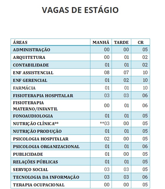 Administração, Arquitetura, Contabilidade, Enfermeira Assistencial, Enfermeiro Gerencial, Farmácia, Fisioterapia Hospitalar, Fisioterapia Materno/Infantil, Fonoaudiologia, Nutrição Clínica, Nutrição Produção, Psicologia Hospitalar, Psicologia Organizacional, Publicidade, Relações Públicas, Serviço Social, Tecnologia da Informação e Terapia Ocupacional.