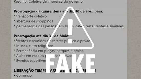 A mensagem com conteúdos falsos diz ainda que o governo teria prorrogado até dia 30 de abril a quarentena dos transportes, shoppings, bares e restaurantes. O texto também fala que eventos, cultos e aulas permanecerão fechados até 31 de abril, além da liberação imediata do comércio, hotéis e pousadas.