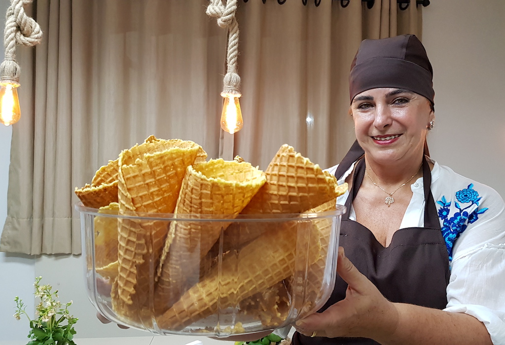 Hermínia, uma das sócias do Affetto Gelato, com as casquinhas de uma receita de biscoito da família