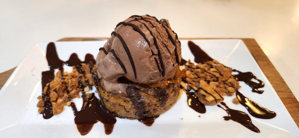 Cookie de chocolate com recheio de nutella. A dica é o sorvete de chocolate vegano (amargo) pra quebrar a doçura