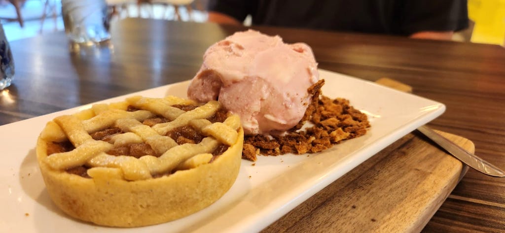 Novidades: Com a chegada da nova sócia, Letícia Orenga, entrou em cena a sobremesa torta de maçã, que vem com uma base crocante de farinha de trigo e manteiga, para receber o creme de maçã leve, acompanhada de uma bola de gelato que o cliente escolhe (frutas vermelhas ficou bom). Para quem gosta de chocolate tem o cookie com recheio de nutella. A dica é o sorvete de chocolate vegano (amargo) pra quebrar a doçura.