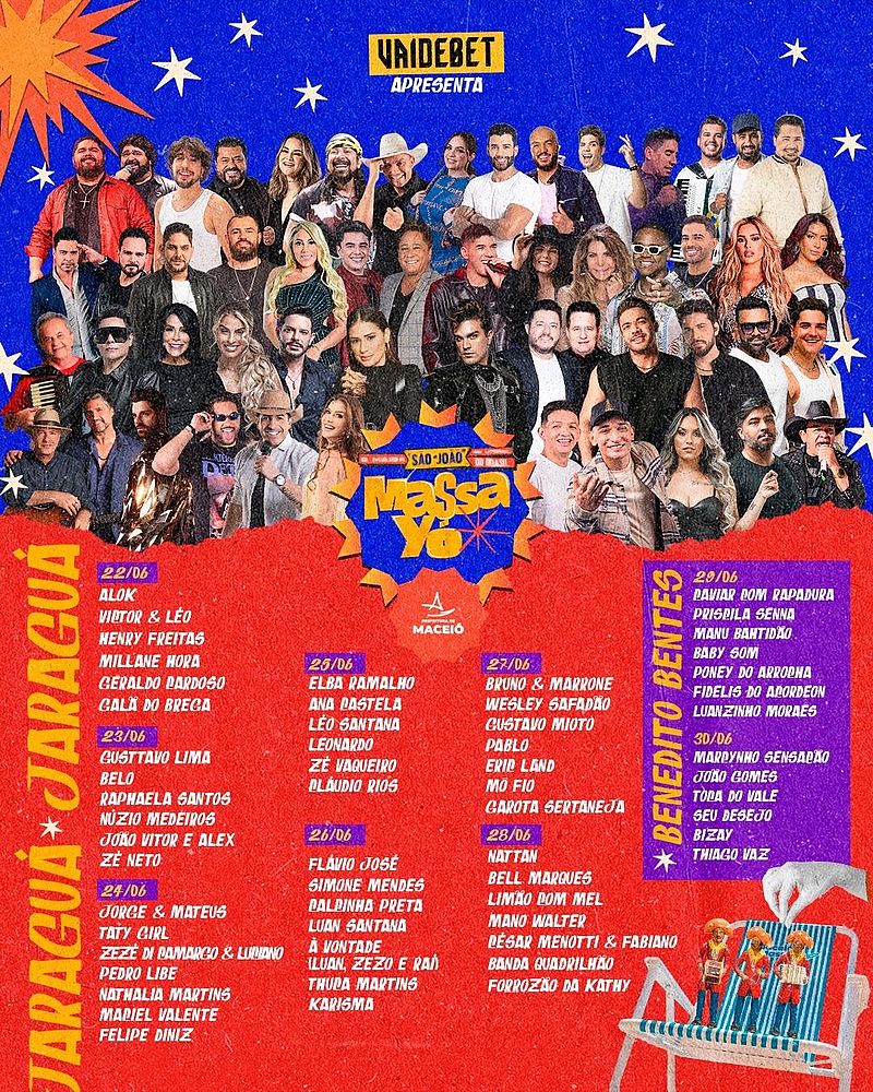 Faltam poucos dias para o início do São João Massayó 2024. O evento vai reunir grandes nomes da música na capital alagoana. A festa é um importante investimento para aquecer a economia num período que antes era conhecido como baixa estação. Este ano a programação será de 22 a 30 de junho, com cerca de 60 atrações de palco. De 22 a 28 a festa acontece em Jaraguá, e de 29 e 30, no Benedito Bentes.
