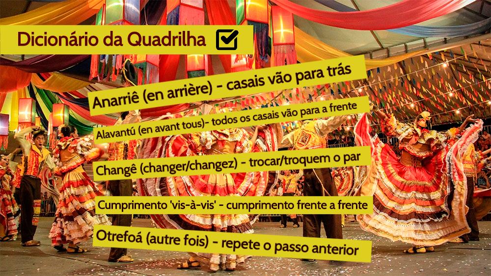 A dança era típica na corte da França, na Paris do século XVIII, onde quatro pares exibiam uma dança de salão. No Brasil foi introduzida no período da Regência, fazendo sucesso nos salões nacionais. Em seguida ela desceu dos palácios e grandes bailes e caiu no gosto popular e, claro, evoluiu para um estilo brincante, lírico e cheio de cores. O tradicional casamento matuto nada mais é do que uma sátira ao casamento de conveniência, típico da burguesia, achincalhando com vários tipos sociais. A influência francesa está inclusive nos famosos passos da dança, o anarriê e alanvantú. Veja no quadro abaixo: