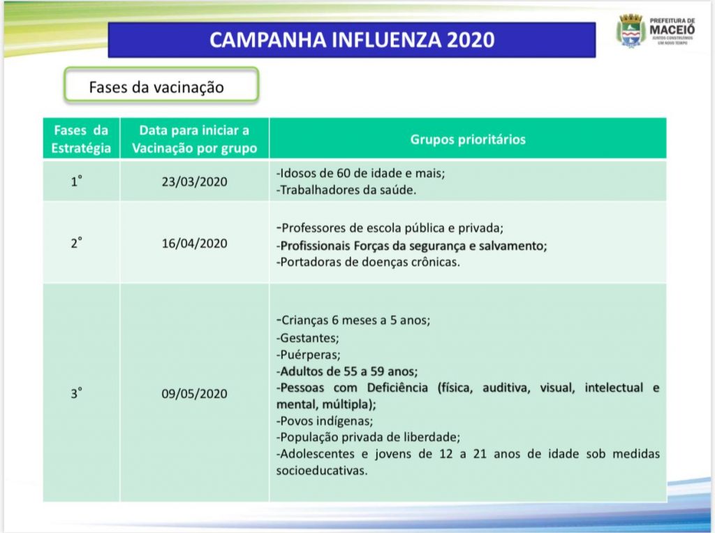 A vacinação tem o objetivo de reduzir as complicações, internações e mortalidades em decorrência das infecções causadas por três tipos do vírus da influenza. Antecipada por determinação do Ministério da Saúde, a intenção é auxiliar os profissionais das unidades de saúde a descartarem a Influenza na triagem de casos para o coronavírus.