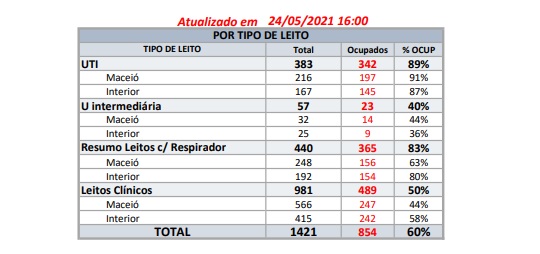 Os dados mostram que, dos 383 leitos de UTI na rede estadual, 342 estão com pacientes internados, o que corresponde a 89% de ocupação. Em Maceió, 91% dos leitos estão ocupados, enquanto o número é de 94% em Arapiraca.