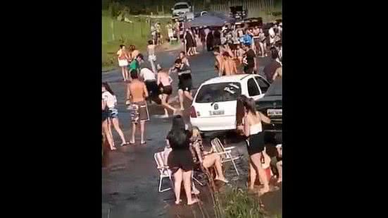 Um vídeo gravado durante a briga entre participantes da festa mostra carros estacionados, uma tenda armada no local e dezenas de pessoas, inclusive crianças. As pessoas estão sem máscara e desrespeitando o distanciamento social, em descumprimento às regras em vigência no Estado por causa da pandemia do coronavírus.